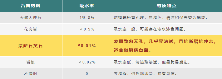 不同材质的吸水率差异较大,以下是一些常见厨房台面材料的吸水率对比: