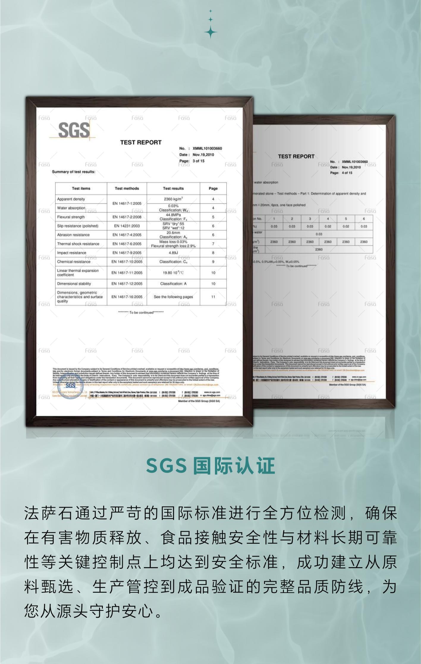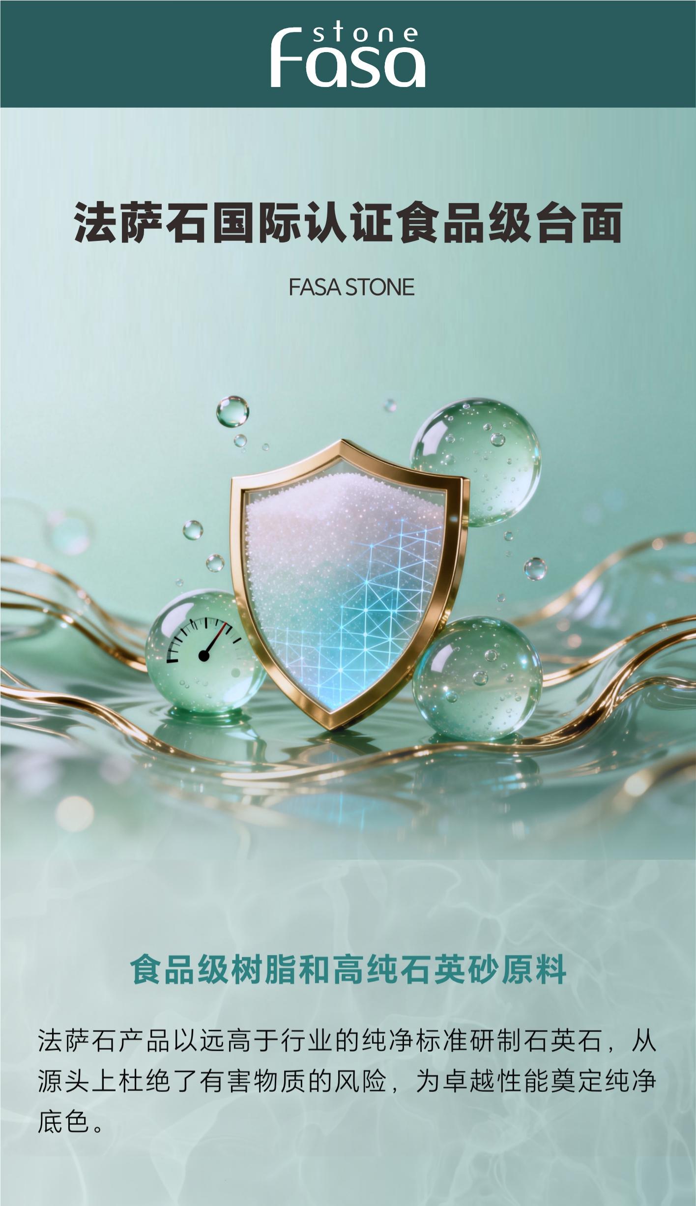 真正安全的食品级台面,源于对产品近乎严苛的全维度保障。早在十多年前行业尚未普遍关注材质安全时,法萨石已先后通过NSF、OU、GREENGUARD GOLD、SGS等多项全球权威认证,建立起从食品接触安全、空气纯净到生产洁净的完整安全保障体系。 十年如一日,持续践行安全标准,将国际安全标准转化为产品基因,为万千家庭提供真正经得起时间考验的安心。