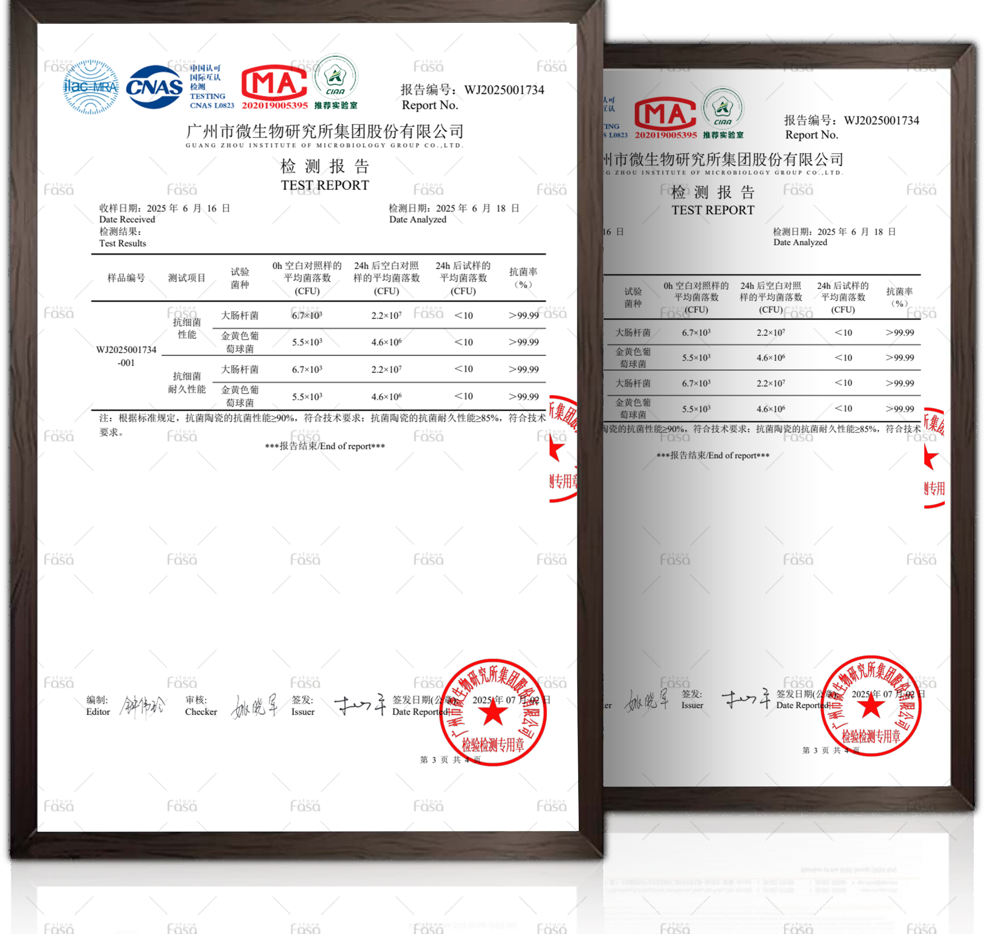 法萨石通过严苛的国际标准进行全方位检测,确保在有害物质释放、食品接触安全性与材料长期可靠性等关键控制点上均达到安全标准,成功建立从原料甄选、生产管控到成品验证的完整品质防线,为您从源头守护安心。