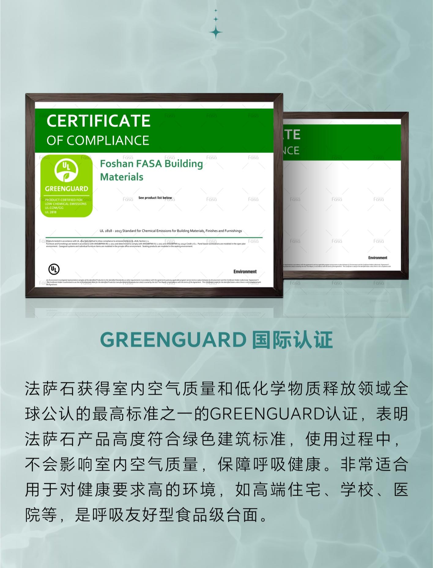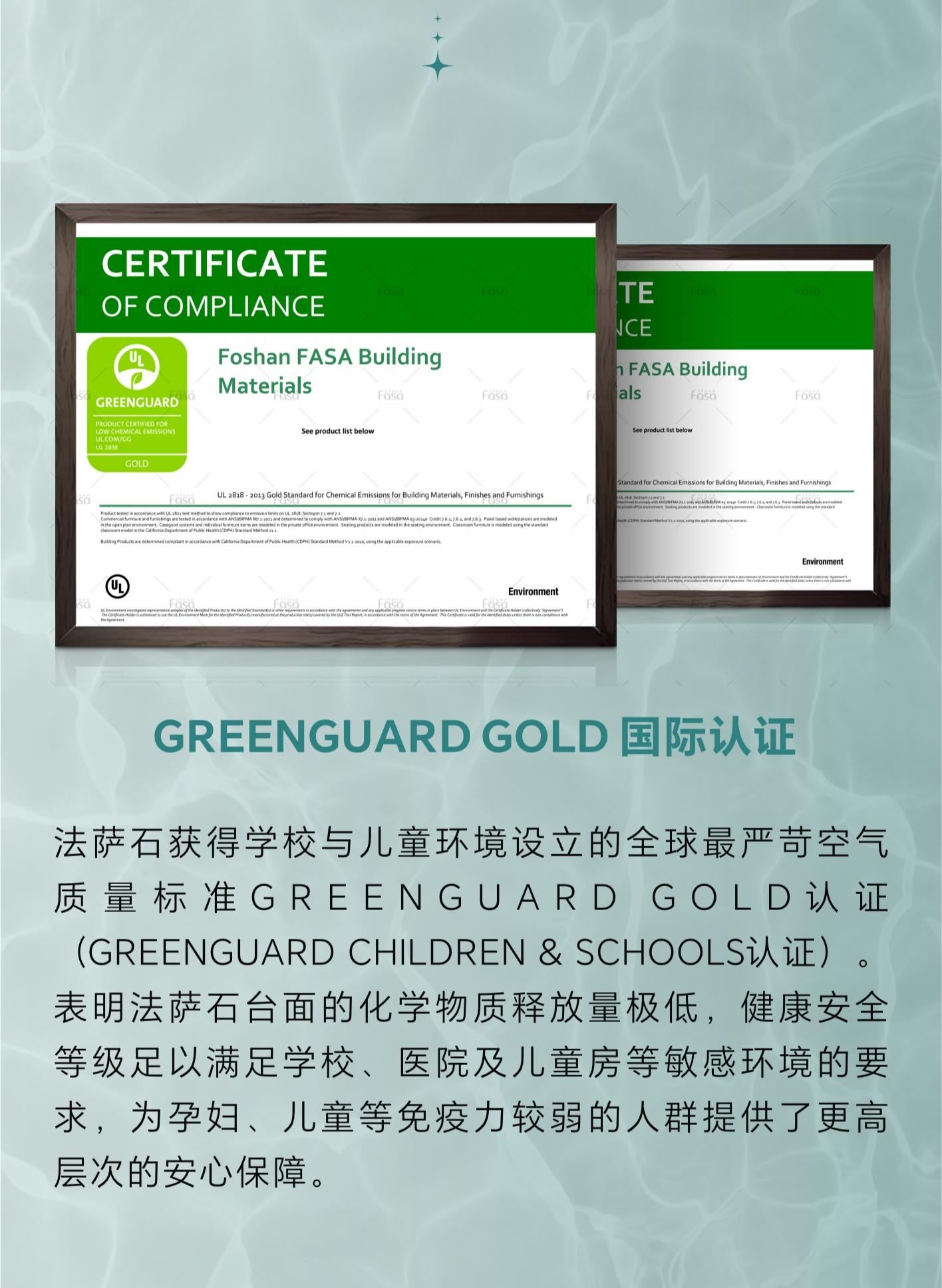 法萨石获得学校与儿童环境设立的全球最严苛空气质量标准GREENGUARD GOLD认证(原GREENGUARD CHILDREN & SCHOOLS认证)。表明法萨石台面的化学物质释放量极低,健康安全等级足以满足学校、医院及儿童房等敏感环境的要求,为孕妇、儿童等免疫力较弱的人群提供了更高层次的安心保障。