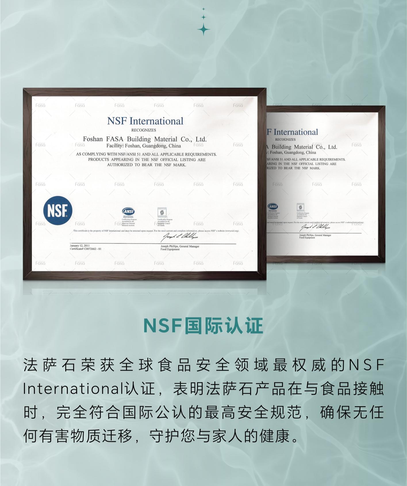 法萨石荣获全球食品安全领域最权威的NSF International认证,表明法萨石产品在与食品接触时,完全符合国际公认的最高安全规范,确保无任何有害物质迁移,守护您与家人的健康。