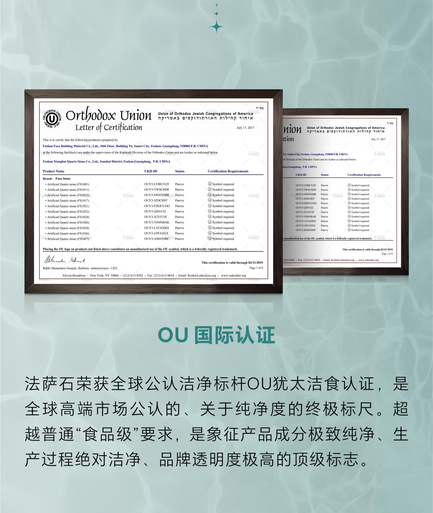 法萨石荣获全球公认洁净标杆OU犹太洁食认证,是全球高端市场公认的、关于纯净度的终极标尺。超越普通“食品级”要求,是象征法萨石产品成分极致纯净、生产过程绝对洁净、品牌透明度极高的顶级标志。