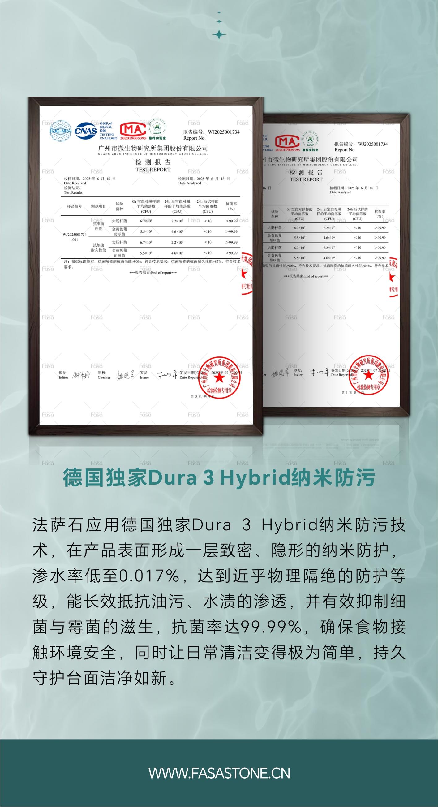 法萨石应用德国独家Dura 3 Hybrid纳米防污技术,在产品表面形成一层致密、隐形的纳米防护,渗水率低至0.017%,达到近乎物理隔绝的防护等级,能长效抵抗油污、水渍的渗透,并有效抑制细菌与霉菌的滋生,抗菌率达99.99%,确保食物接触环境安全,同时让日常清洁变得极为简单,持久守护台面洁净如新。